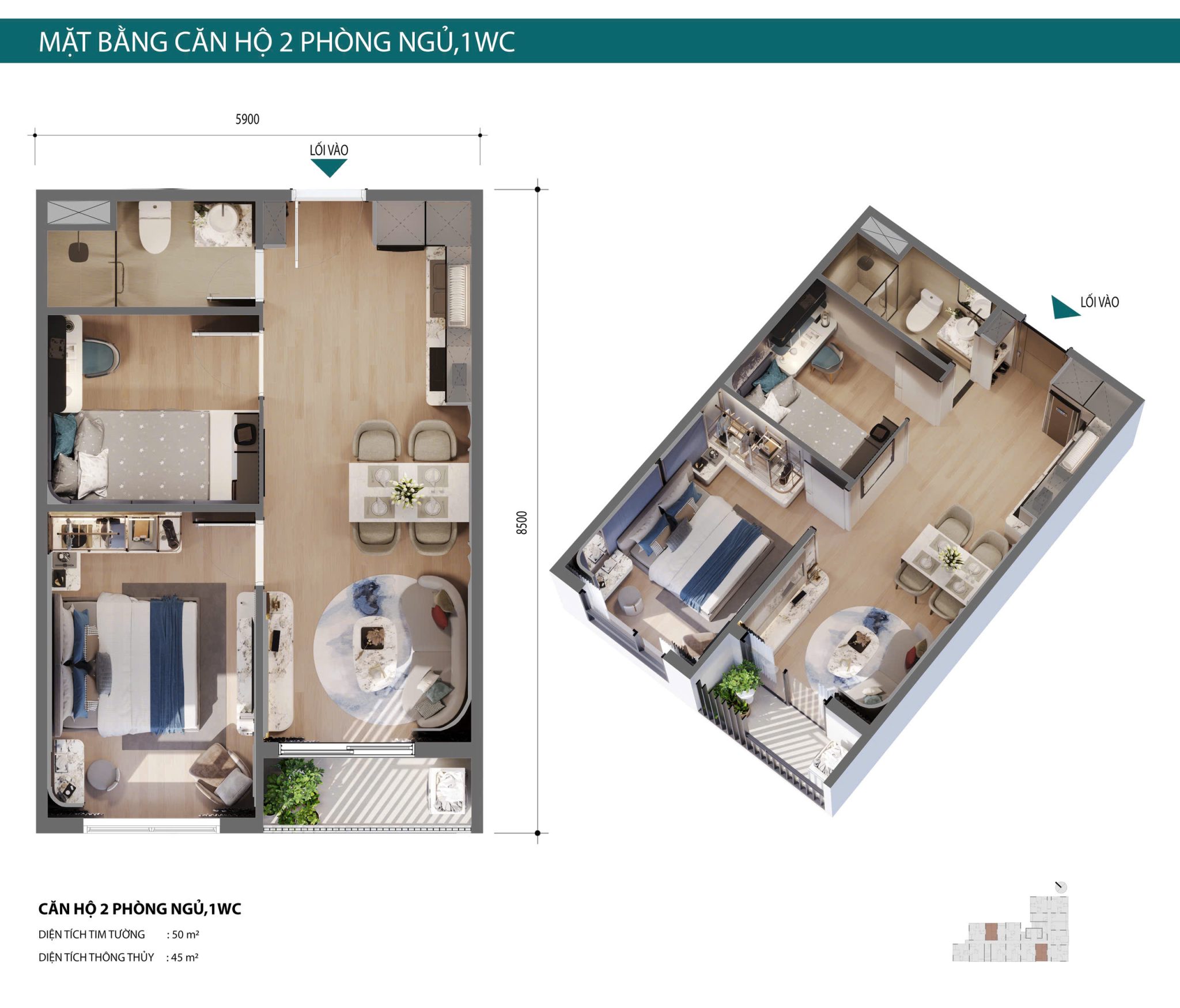 THIẾT KẾ CĂN HỘ 50m2 2PN-1WC