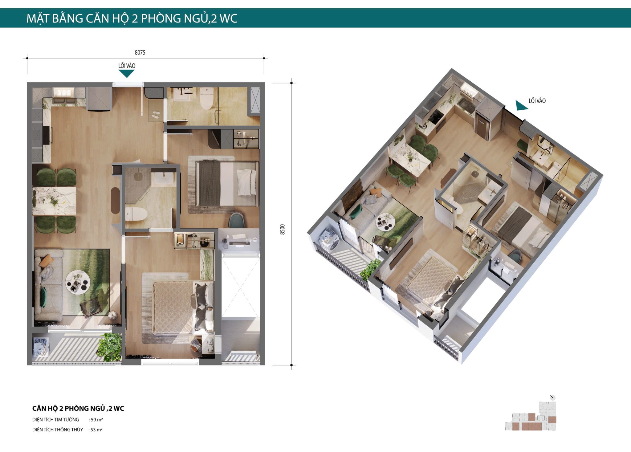 THIẾT KẾ CĂN HỘ 59m2 2PN-2WC