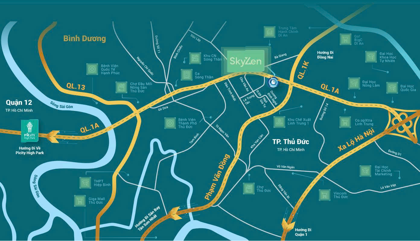 Chỉ cách cầu vượt Linh Xuân, Quốc lộ 13, Phạm Văn Đồng, đại lộ Bình Dương trong bán kính 500m, Picity Sky Zen dễ dàng tiếp cận hệ sinh thái tiện ích sầm uất của TP Dĩ An và TP Thủ Đức.